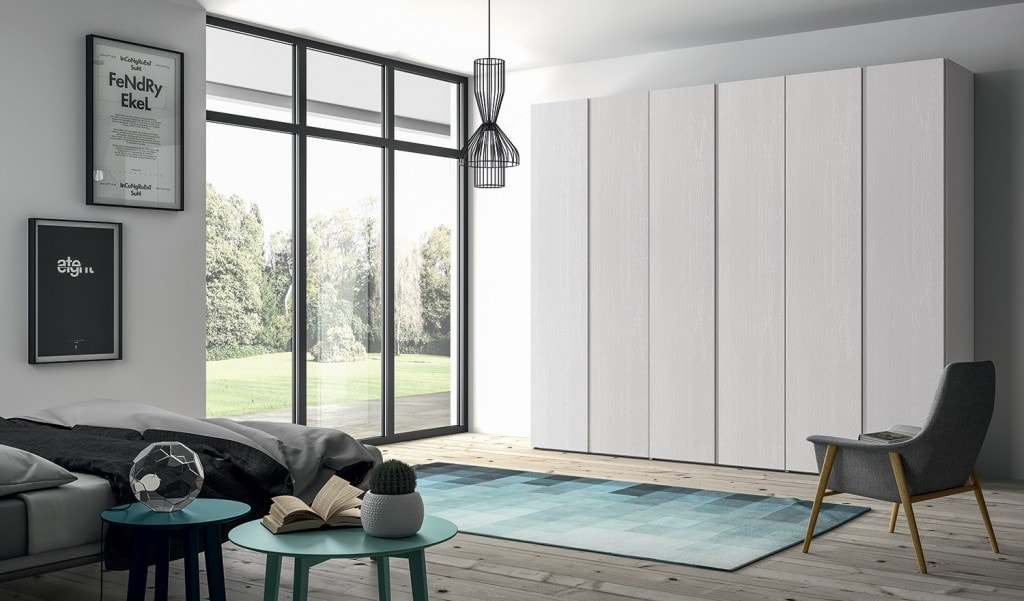Description: Front and side panels in extra white elm melamine. Interior in decorative fabric. With integrated handles. Double hanging throughout (drawers/partitions/shelving/pull outs/lighting can be added).